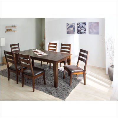 14020 Set Features: -Set includes table and six side chairs. -Rich Walnut finish. -Country style. -Solid hardwood legs. -Leg table extends with leaf. -Durable brown bycast seat upholstery. -Frame construction: Solid hardwood. -Ladder back. -Flexible back allows to lean back and relax while dining.