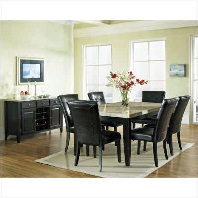 [***INCLUDED IN THIS SET: (1)Monarch Wine Rack / Server in Multi-Step Black, (1)Monarch Dining Table in Multi-Step Black, (6)Monarch Parsons Chair in Multi-Step Black] The Monarch Marble-Top Dining Table and Chairs offers a fashionable subtle appear to any dining room. Offered in a deep black end with a contrasting off-white marble prime, this trendy set will complete any kitchen/dining room. Features: -Set includes eating desk and 6 parsons chairs. -Monarch collection. -Multi-Step Black end. -Seat and back upholstered in tufted Black leather. -Off-White marble desk top. -Contemporary model. -Corner blocked. -Tongue and groove joints. -Manufacturer provides three hundred and sixty five days limited guarantee. -Seat height: 18''.Bundle-96 Monarch 7 Piece Dining Table Set in Multi-Step Black Rating